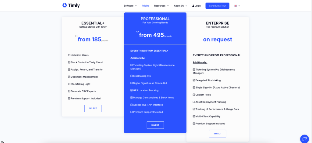 Timly operates on a subscription basis, with pricing starting near €185 per month, scaling according to asset volume and feature selection.